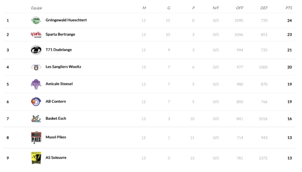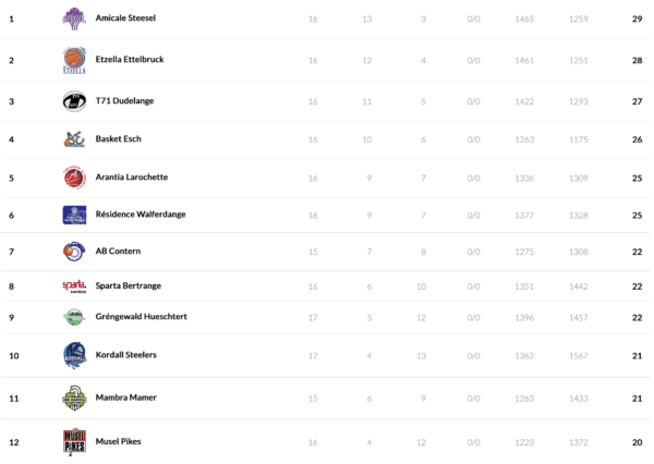 After earning victory during the week, Gréngewald Hueschtert has a chance to make a serious push at the play-off places with a road win in Contern while the hosts can improve their good position. The most interesting game in the play-off race will be played in Mamer where Mambra (6:9) takes on Sparta (6:10). The first game between both teams was arguably the most thrilling game all season and ended with a buzzer beater in overtime in favor of Mamer (115:112), the direct comparison might be the tie breaker after 22 games so that both teams will try to earn that comparison.