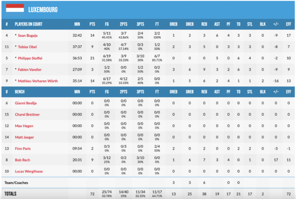 Philippe Stoffel led the team with 21 points, Mathieu Verharen and Sean Bugeja added 14 points for the FLBB squad. Luxembourg was outrebounded 38:64 but still had a chance to tie the game late in the game. The next game will be on Monday against Switzerland.