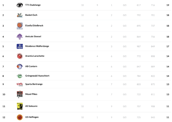 League leader T71 will host Amicale for a finals rematch of the 2021/22 season. Both teams have started the season strong and will now face off in the top game of the week. After advancing to the cup semi-finals, newcomer Gréngewald is looking for its 5th win in the LBBL when they host Etzella. The guests entered the cup semi-finals as well during the week but they also want to show a reaction after losing last week’s top game against T71. US Heffingen is currently at the bottom of the standings, the team recently added 2 new professional players: Gillard and Hansen. At home, the team faces another difficult challenge with opponent Basket Esch. The guests have played well lately and are back at full strength after Pit Biever and Jordan Hicks returned to the team. A big game in the race for the top 8 seeds will be played in Contern where the hosts have a chance to take a 2-point lead over the opponent Sparta. The team from Bertrange has a chance to tie with the opponent in the standings and both team will definitely also look to pay attention to the score at any moment because the direct comparison could become decisive at the end of the regular season. Résidence Walfer is looking to a 2-game losing streak at home against the Musel Pikes while the guests are looking for a 4th win to stay in a decent position in the play-off race. The Musel Pikes announced on Friday that they have added a new professional player in Devonte Patterson. On Sunday, Arantia is looking for its thrid straight win on the road in Zolwer. The hosts have only 1 victory at the moment and sit at the bottom of the standings together with Heffingen.