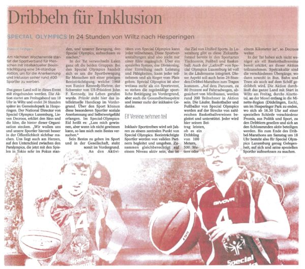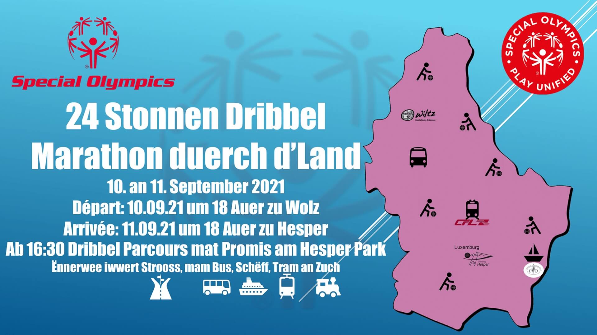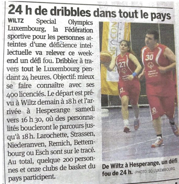 Special Olympics Lëtzebuerg hunn mat enger besoonescher Aktioun op sech opmirksam gemaach. Vun e Fréiden an der Nuecht op e Samschden gëtt 24 Stonnen laang « gedribbelt », dat duerch d’ganz Land vun Wolz bis op Hesper an Zesummenarbecht mat verschiddene Veräiner.