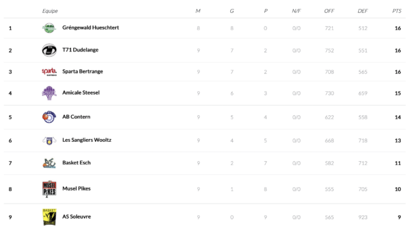 The unbeaten league leader Gréngewald Hueschtert (8:0) is facing the Musel Pikes (1:8) on the road in a game where the guests are the clear favorite. The top game will be played in Dudelange between T71 (7:2) and Sparta (7:2), the winner of this game will take the second place in the standings. One game is scheduled on Sunday, the winless team Zolwer (0:9) will face Amicale Steinsel (6:3). With a victory, the guests will climb to the third place in the standings, tied with either Dudelange or Bertrange.