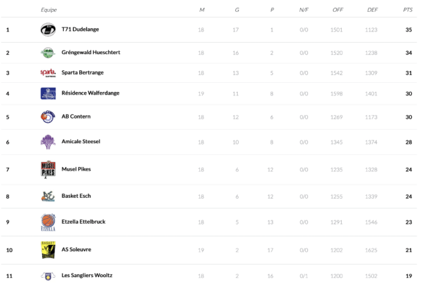 Amicale Steinsel has a chance to clinch the number one seed in the men’s LBBL this weekend, Steinsel will be challenged on the road against Résidence in the derby. Basket Esch (who earns the direct comparison against Amicale) and T71 Dudelange need victories to keep the pressure on the current league leader.