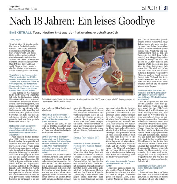 18 Jahre, über 110 Länderspiele: Kaum eine Basketballspielerin kann in Luxemburg eine ähnliche Nationalmannschaftskarriere aufweisen wie Tessy Hetting. Die dreifache Goldmedaillengewinnerin bei den Spielen der kleinen Staaten verkündete am Sonntag nun ihren Rücktritt aus der FLBB-Auswahl. Ein Abschied, den sich die 34-Jährige jedoch gerne etwas anders gewünscht hätte.