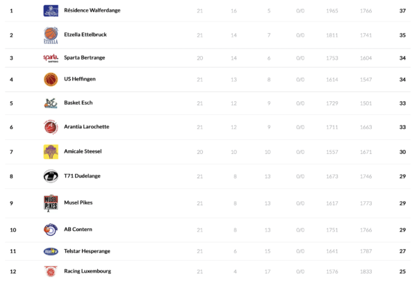 Sparta could potentially end up as the number one seed after 22 games, they need 2 wins this week and a loss by leader Résidence at the same time. Amicale is currently 7th in the standings. Theoretically, Amicale could catch Basket Esch, but they would need to win both games this week and beat Esch by 36 points on Saturday-evening. A 3-team tie between Amicale, Basket Esch and Arantia is also a possibility.