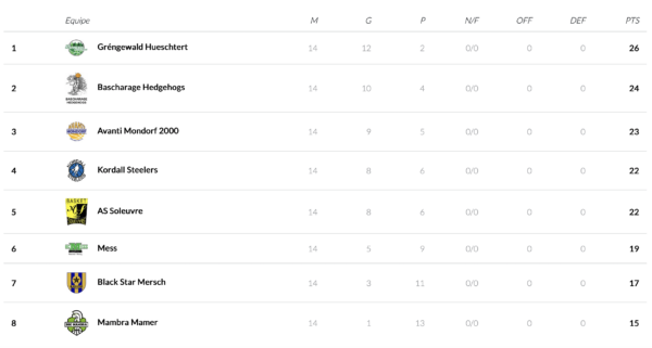 At the winter break, Gréngewald Hueschtert is leading the league with 12 games won out of 14, Bascharage sits in the second promotion spot at this moment while Mondorf would play the promotion series (currently against Telstar Hesper) after a surprisingly strong season so far. Kordall did not manage to play up to their potential so far as the team was a favorite for the promotion spots before the season. Zolwer has had issues with their professional players and therefore started the season slow but the team has been on the rise over the last weeks. BC Mess can not be satisfied with a 6th place as the team entered the season with high ambitions. Mamer and Black Star would relegate to the National 3 at this moment, something every team wants to avoid. Next to several (professional) player changes, Black Star and Kordall already made a change at the coaching chair.
