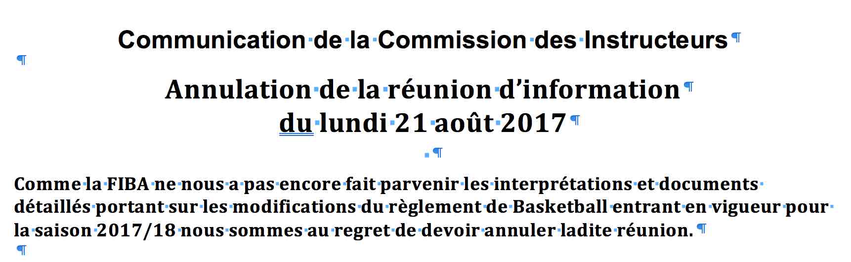 Comme la FIBA ne nous a pas encore fait parvenir les interprétations et documents détaillés portant sur les modifications du règlement de Basketball entrant en vigueur pour la saison 2017/18 nous sommes au regret de devoir annuler ladite réunion.
