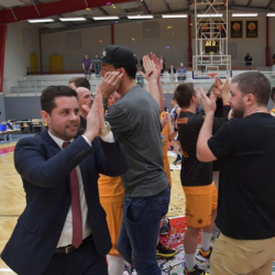 Philippe Gutenkauf and his teammate Henry Pwono connect on an alley oop dunk against Contern to score the 100th point... View Article