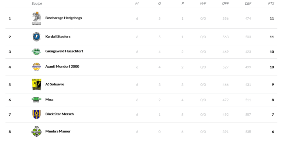 Next to Bascharage, the Kordall Steelers are on top of the standings with a 5:1 record after this weekend. The team around Max Schmit had 5 players with 11+ points and knocked down 12 « 3-pointers » while Barkley led the team with 34 points in their 94:86 win over Gréngewald. The greens stay in a good position with a 4:2 record.