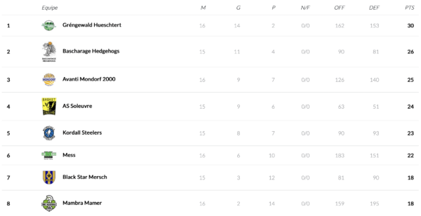 League leader Gréngewald stays on top of the secon division with a 14:2 record after beating BC Mess in a hard fought game behind 10 made shots from behind the arc. After 40 minutes, the greens won 85:78. Barnes and Janssen both scored 26 points and Henkel added 16 points for Gréngewald to overcome 30 points by Coleman. BC Mess (6:10) will need its focus to stay in the league, they have the advantage over Black Star and Mamer at the moment.
