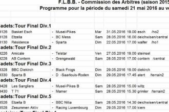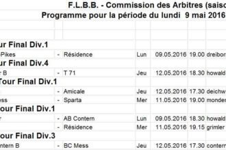Hommes:   1. Mercredi 4 mai 2016 à Steinsel   20h30 Amicale Steinsel - Musel Pikes   2. Samedi 7 mai 2016 à Stadtbredimus   20h15 Muse...