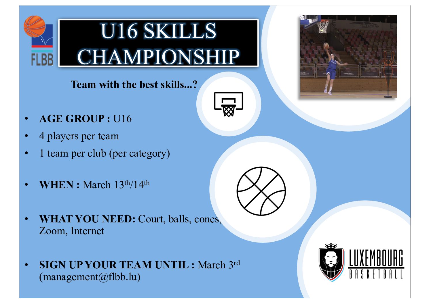After the U14 skills challenge, the FLBB will now organize a skills challenge for the U16 teams (Scolaires / Filles-Scolaires). The goal of this project is to keep the players acti...