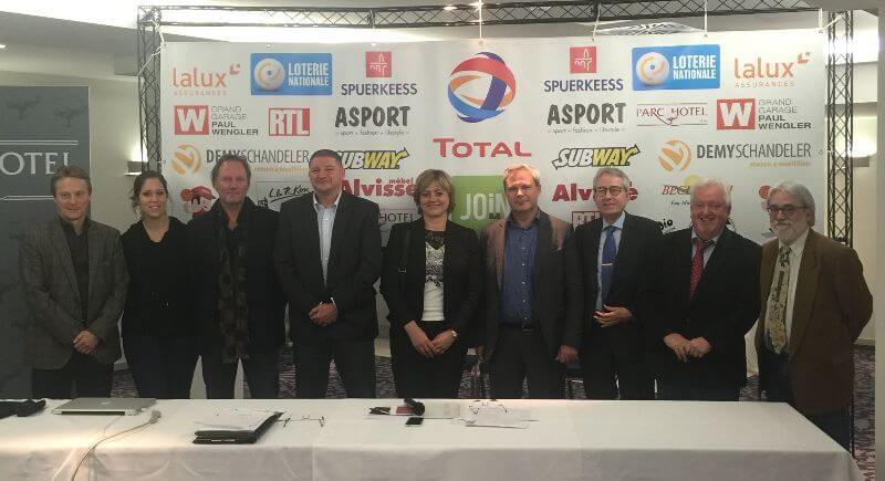 Roby LANGERS (Loterie Nationale). Jil FISCHER (JOIN- Experience), Frank FISCHER (JOIN Experience), Henri PLEIMLING (Président FLBB), Monique HESS (B.C.E.E. – Spuerkeess), Frédéric SANTONI (TOTAL Luxembourg), Jean-Paul MEYER (LALUX), Romain HOFFMANN (Vice-président FLBB), Ernest HUSS ( Trésorier FLBB).
