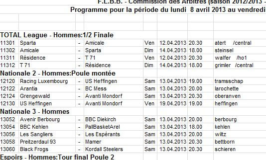 Programme pour la période du lundi 8 avril 2013 au vendredi 19 avril 2013