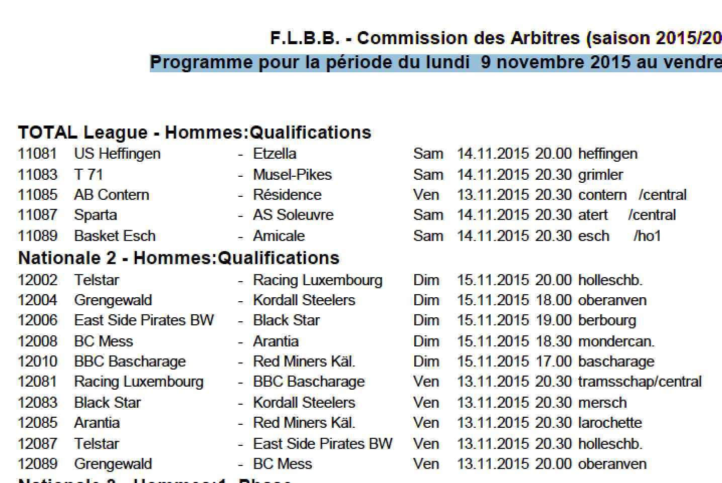 Programme pour la période du lundi 9 novembre 2015 au vendredi 20 novembre 2015