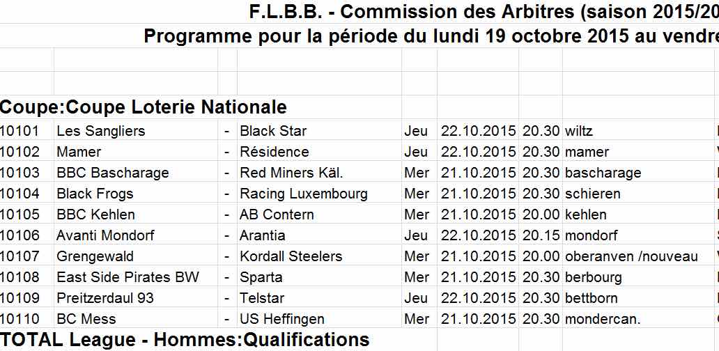 Programme pour la période du lundi 19 octobre 2015 au vendredi 30 octobre 2015