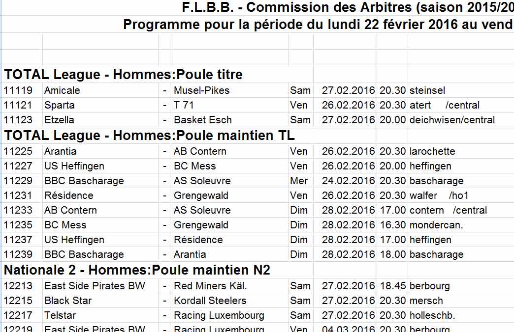Programme pour la période du lundi 22 février 2016 au vendredi 4 mars 2016