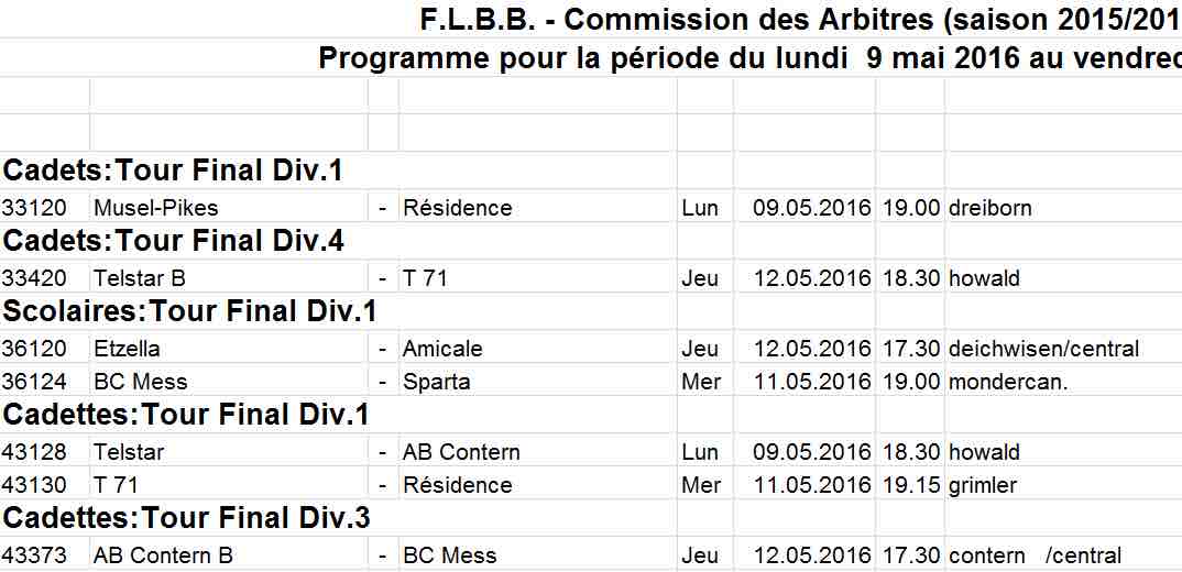 Programme pour la période du lundi 9 mai 2016 au vendredi 20 mai 2016