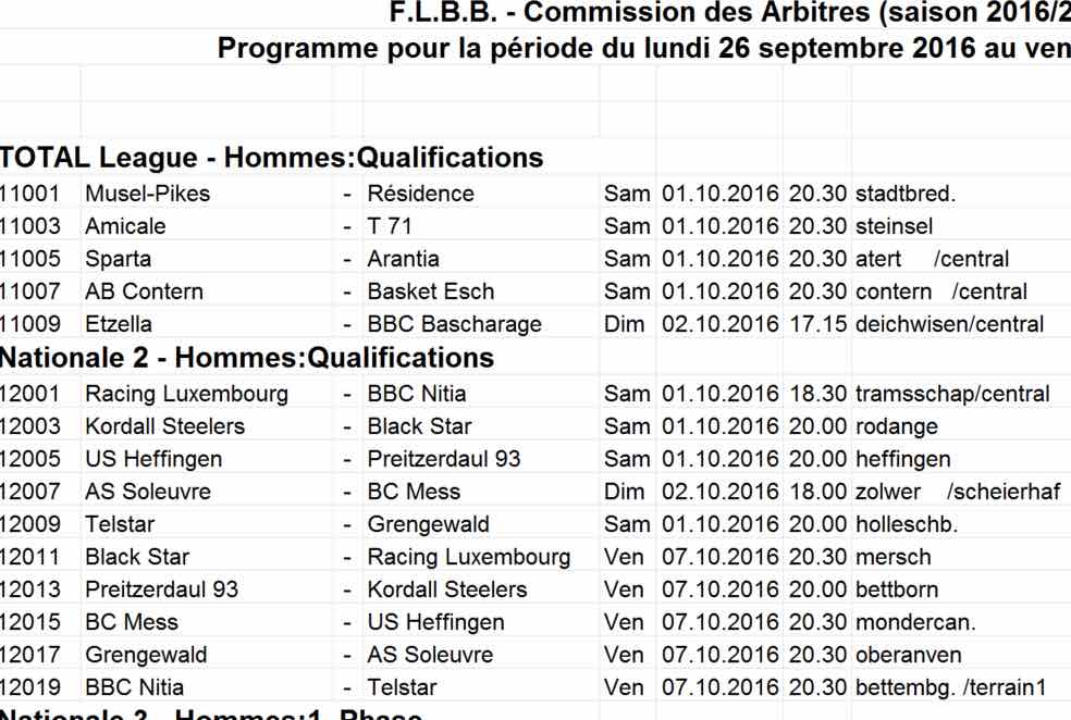 Programme pour la période du lundi 26 septembre 2016 au vendredi 7 octobre 2016