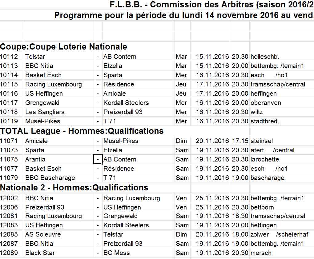 Programme pour la période du lundi 14 novembre 2016 au vendredi 25 novembre 2016