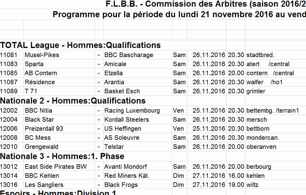 Programme pour la période du lundi 21 novembre 2016 au vendredi 2 décembre 2016