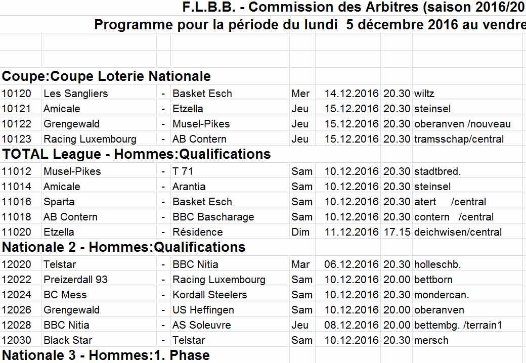 Programme pour la période du lundi 5 décembre 2016 au vendredi 16 décembre 2016