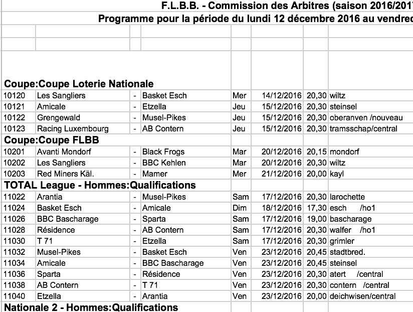 Programme pour la période du lundi 12 décembre 2016 au vendredi 23 décembre 2016