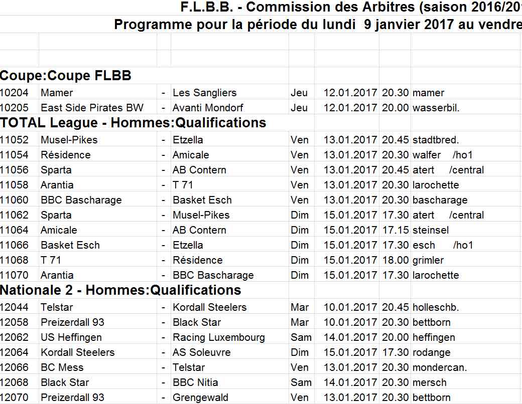 Programme pour la période du lundi 9 janvier 2017 au vendredi 20 janvier 2017