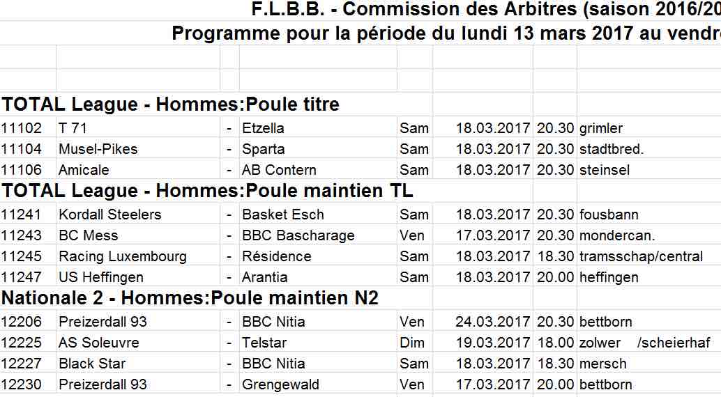 Programme pour la période du lundi 13 mars 2017 au vendredi 24 mars 2017