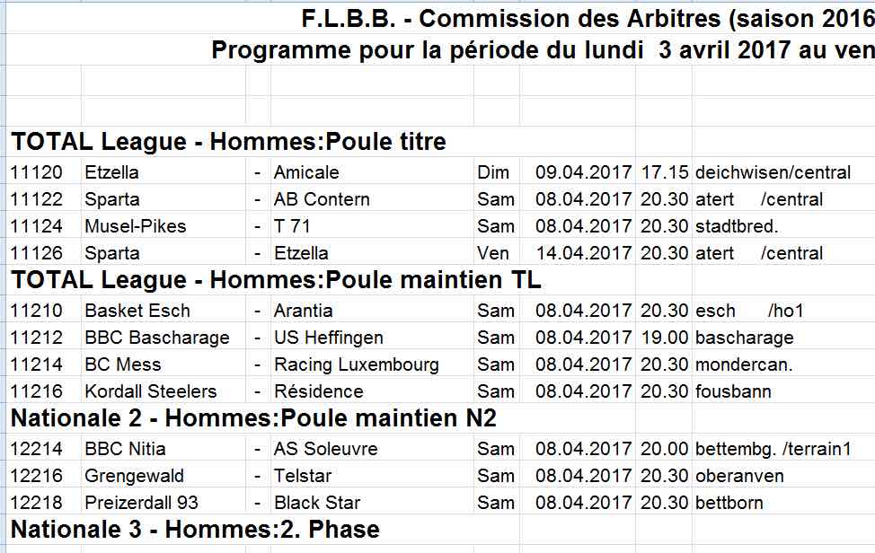 Programme pour la période du lundi 3 avril 2017 au vendredi 14 avril 2017