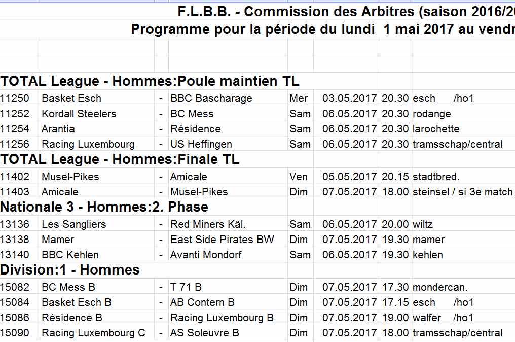 Programme pour la période du lundi 1 mai 2017 au vendredi 12 mai 2017