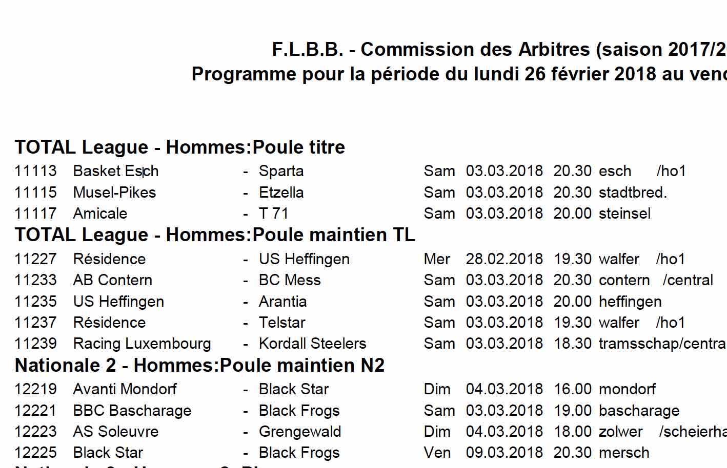 Programme pour la période du lundi 26 février 2018 au vendredi 9 mars 2018