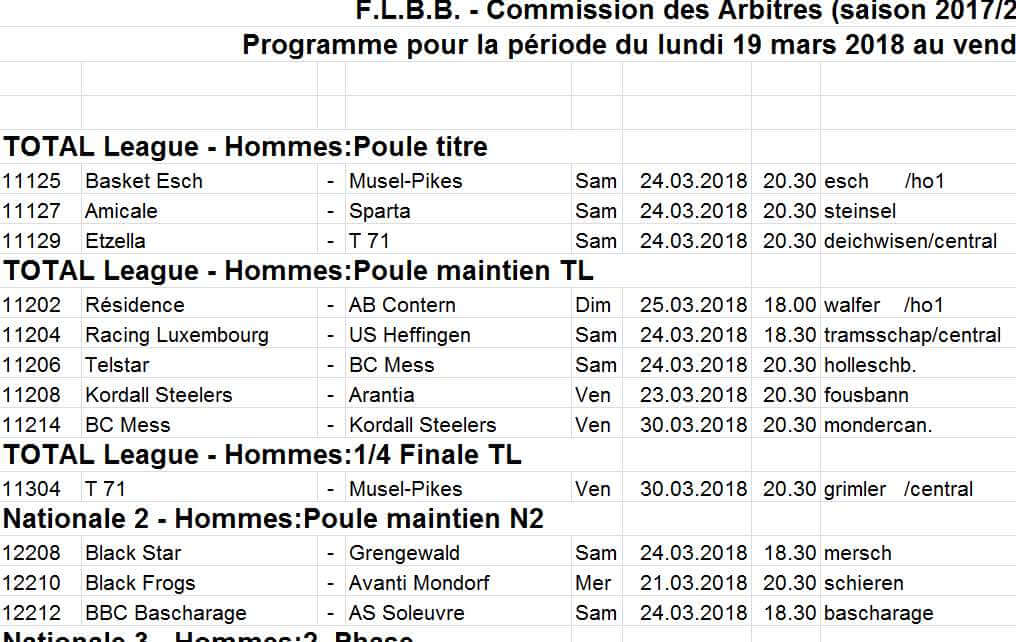 Programme pour la période du lundi 19 mars 2018 au vendredi 30 mars 2018