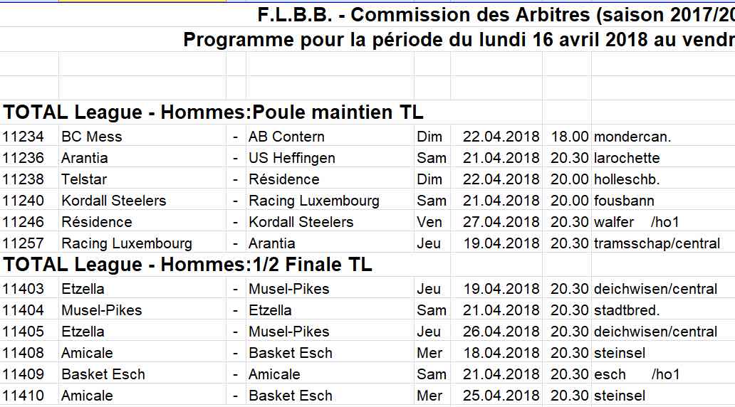 Programme pour la période du lundi 16 avril 2018 au vendredi 27 avril 2018