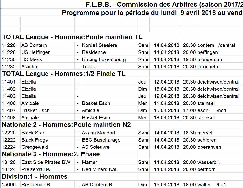 Programme pour la période du lundi 9 avril 2018 au vendredi 20 avril 2018