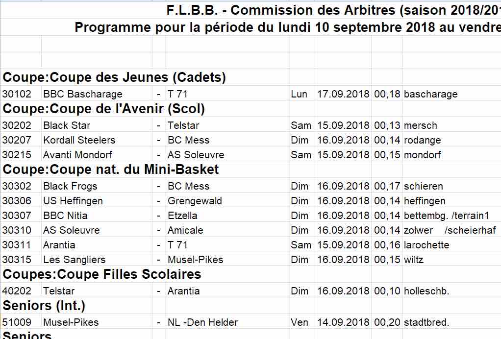 Programme pour la période du lundi 10 septembre 2018 au vendredi 21 septembre 2018