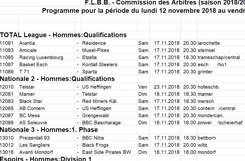 Programme pour la période du lundi 12 novembre 2018 au vendredi 23 novembre 2018