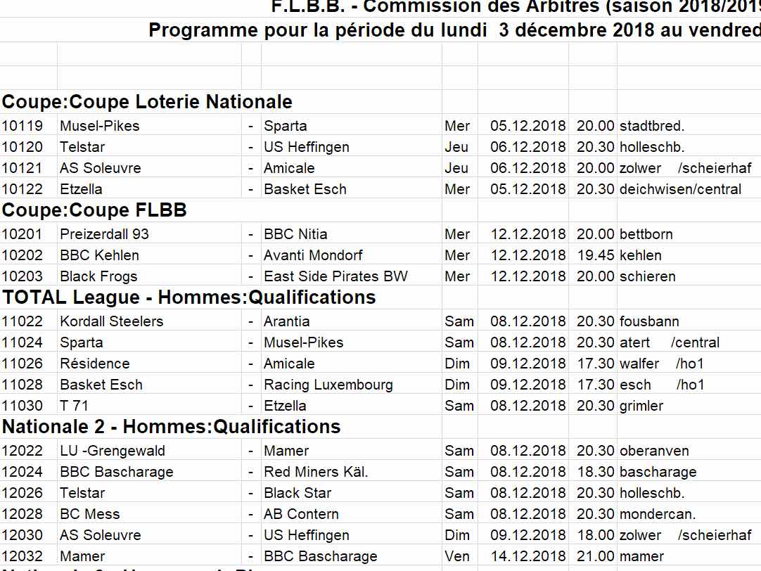 Programme pour la période du lundi 3 décembre 2018 au vendredi 14 décembre 2018