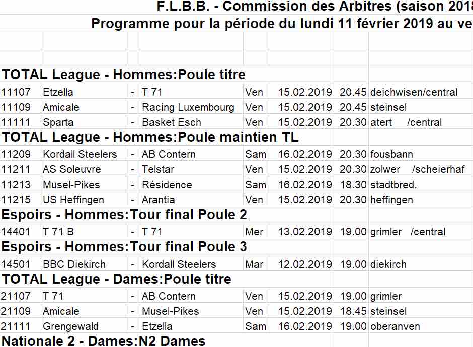 Programme pour la période du lundi 11 février 2019 au vendredi 22 février 2019