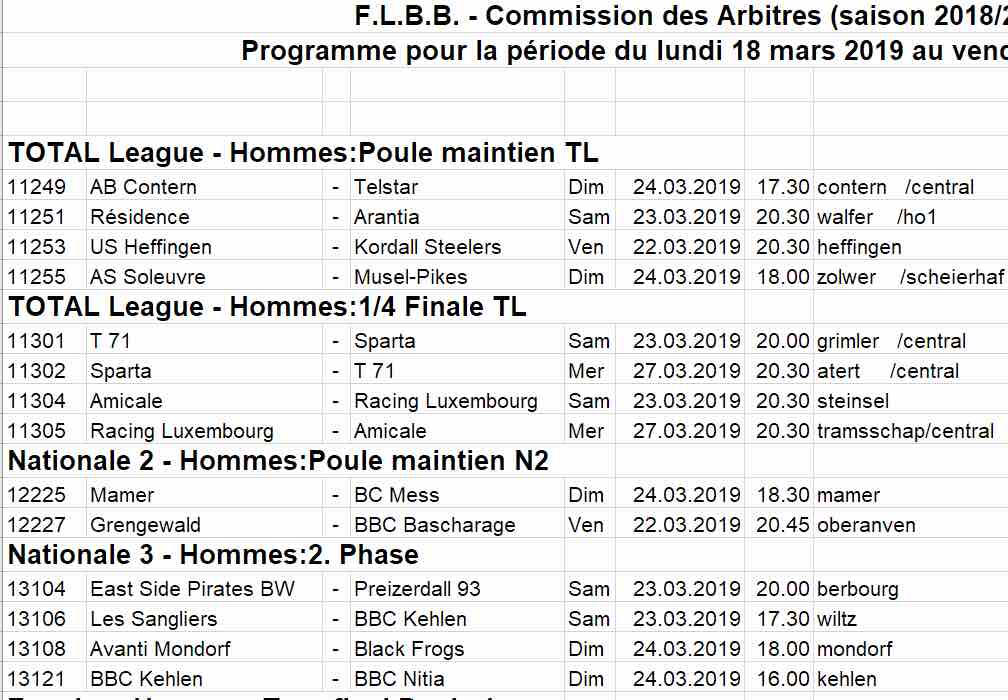 Programme pour la période du lundi 18 mars 2019 au vendredi 29 mars 2019