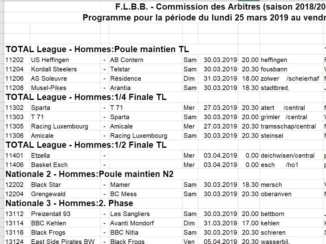 Programme pour la période du lundi 25 mars 2019 au vendredi 5 avril 2019