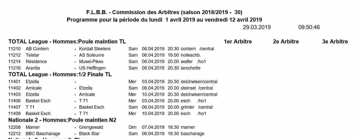 Programme pour la période du lundi 1 avril 2019 au vendredi 12 avril 2019