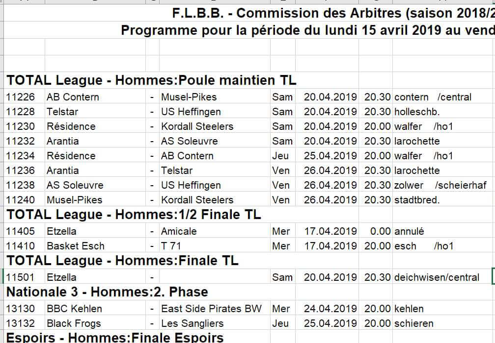 Programme pour la période du lundi 15 avril 2019 au vendredi 26 avril 2019