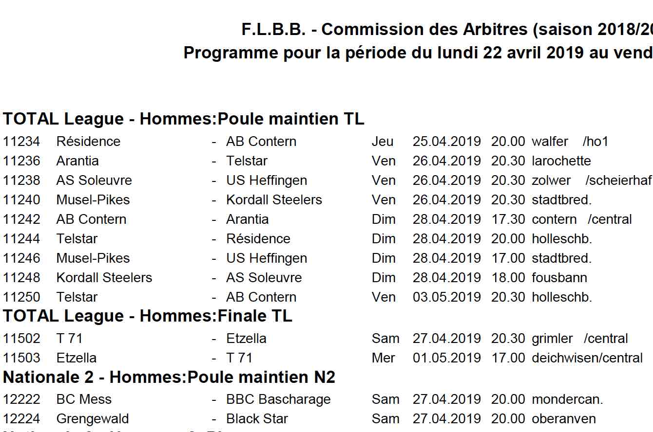 Programme pour la période du lundi 22 avril 2019 au vendredi 3 mai 2019
