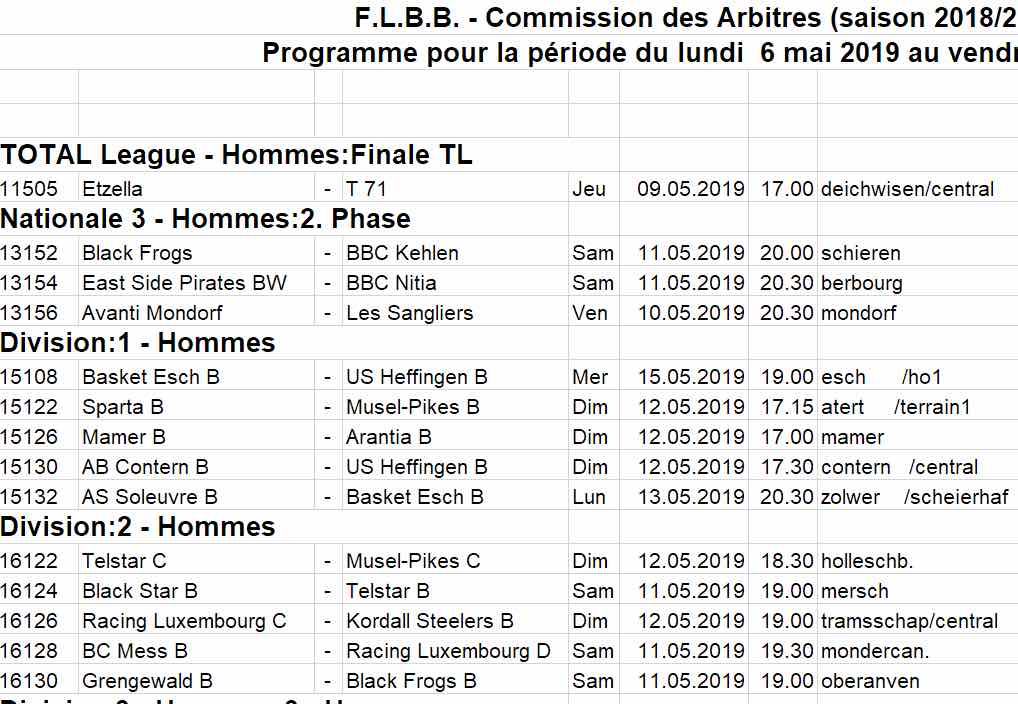 Programme pour la période du lundi 6 mai 2019 au vendredi 17 mai 2019