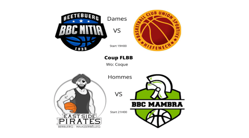 An der COUPE FLBB stinn sech bei den Dammen Nitia Beetbuerg an US Hiefenech ab 19:00 Auer géintiwwer, bei den Hären spillen East Side Pirates géint Mamer (ab 20:45 Auer).