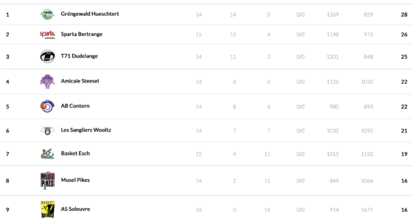 The play-off chances of Gréngewald and Kordall (both 5:14) are small, both teams need to win their remaining games and hope for rivals to lose in order to get back into the mix. Mamer (6:12) also needs victories to put pressure on Sparta. If Mamer loses both games this weekend and Sparta grabs a win on Friday, Mamer will play in the relegation group. It is possible that we will know the 8 play-off teams on Sunday evening – an exciting weekend is ahead.