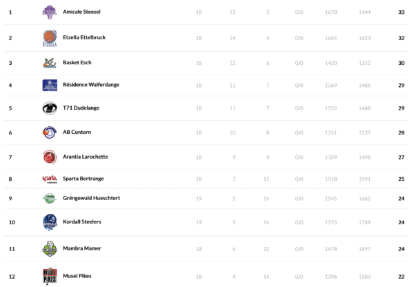 In the women’s LBBL, 2 games are scheduled on Friday while one game from game day 17 is scheduled for Saturday. There is a possibility that the places 1-6 will be known after this game day. If Amicale, T71 and Gréngewald win their game, the standings will be known. (1. Gréngewald , 2. T71, 3. Sparta, 4. Amicale, 5. Contern, 6. Wiltz).