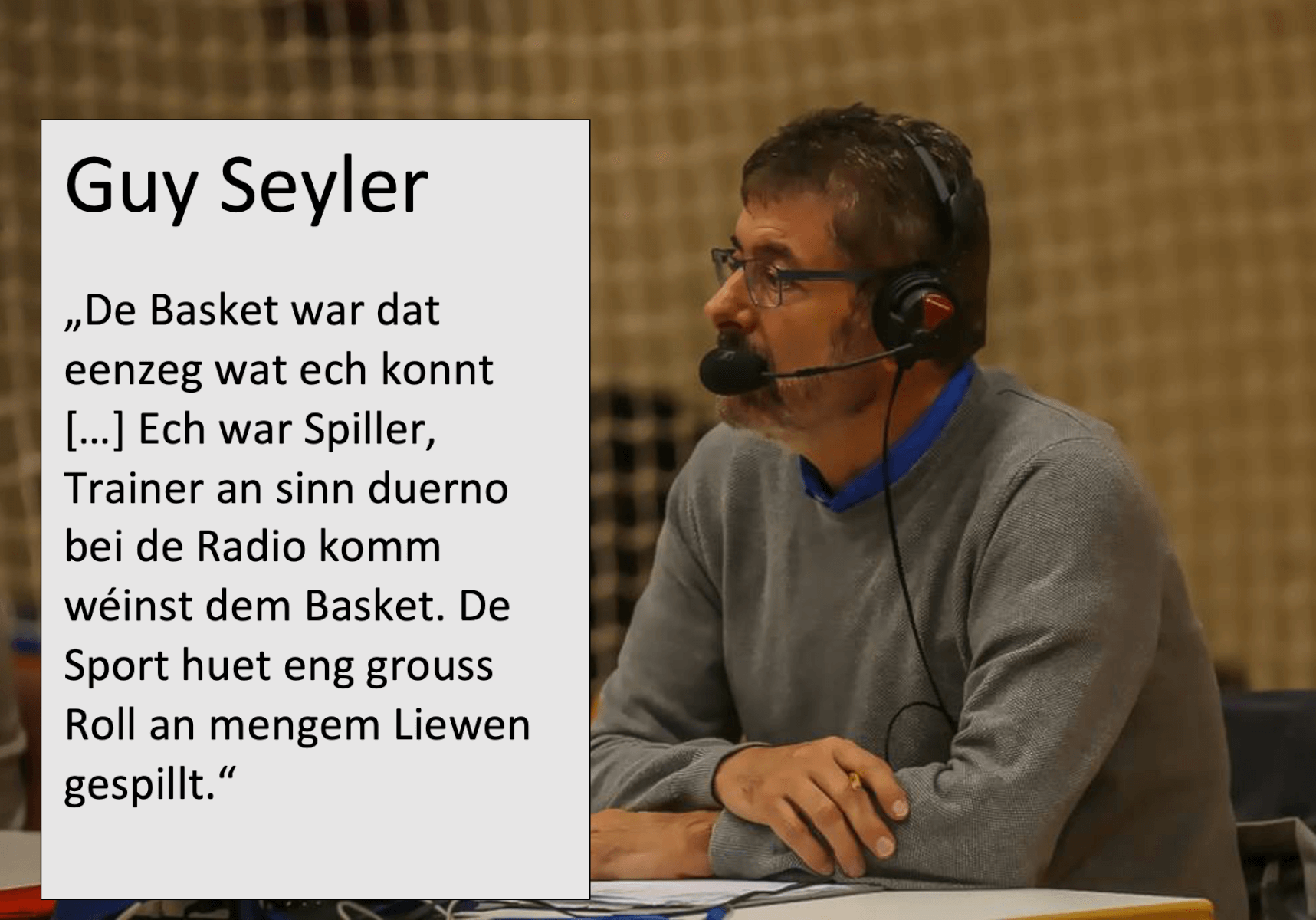 De Guy Seyler ass een vun de bekanntste Gesichter am Lëtzebuerger Basket. Spiller, Trainer, Reporter bei RTL, hien kënnt de Sport aus ville Perspektiven. Am Interview schwätzt hien iwwer vill Themen an erzielt e puer Anekdoten.