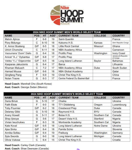 Official description on the webpage of the event: The Nike Hoop Summit showcases America’s top mens and womens high school seniors against the best players from around the world who are 19 years old or younger. The annual Nike Hoop Summit, which now includes a womens version of the game is scheduled to take place April 13, 2024 at the Moda Center in Portland, OR. The women’s game is scheduled for a 4:30pm tip and the 25th anniversary of thmen’s game will tip off at 7:00pm.