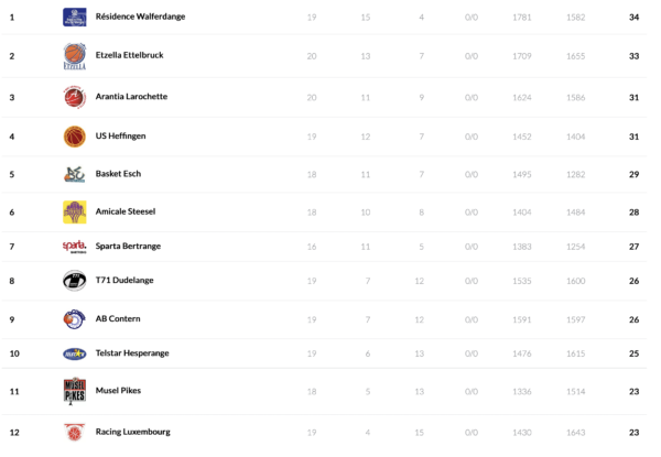 While many teams have already qualified for the play-offs that will be played in a new format (1 versus 8, 2 versus 7, 3 versus 6, 4 versus 5), T71, Contern, Telstar, the Musel Pikes and Racing are the teams that have a negative record at the moment and are therefore in the second half of the standings.